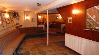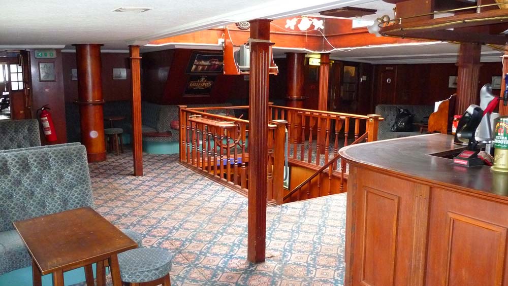 Above, some view from the main deck forward bar. The first view is looking aft, down the starboard side. Again it's hard to convey the size if this space which is filled somewhat by having the bar bang in the middle! The next photo is looking aft from further back on the starboard side and I guess the stairs leading down to the lower forward bar as described above are roughly in the same position as the crew accomodation stairs on Waverley.